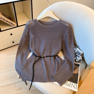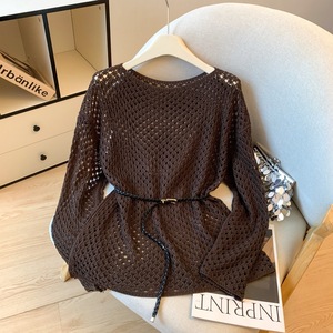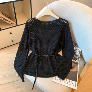 2025早秋新款法式慵懒防晒罩衫女配腰带宽松显瘦镂空针织外搭上衣