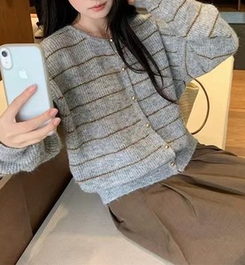 韩国东大门复古早秋新款羊驼毛高级针织衫条纹小金扣毛衣外套外穿
