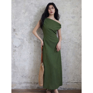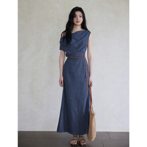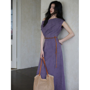 贰羊设计【未央】新中式斜肩荡领连衣裙女气质紫色设计感收腰长裙