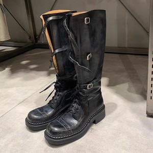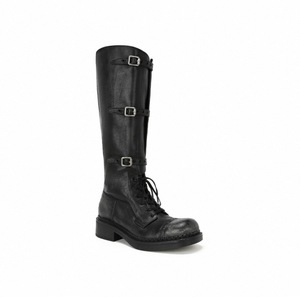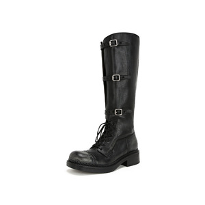 羊皮~阿miu家圆头粗跟复古小众长靴女皮带扣系带时髦精中筒骑士靴