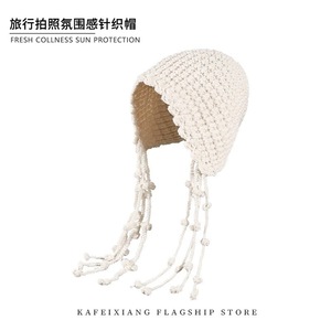 红色流苏球针织包头帽子女秋冬季川西旅游穿搭镂空显脸小毛线帽