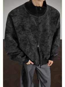 灰色扎染PU皮夹克男秋季美式复古boxy版型外套痞帅立领工装棒球服