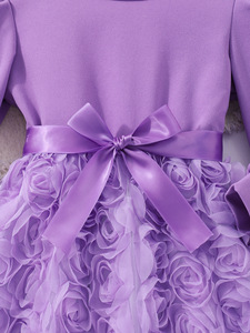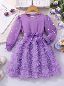 中小童(女)连衣裙,纯色立体花朵珍珠长袖连衣裙