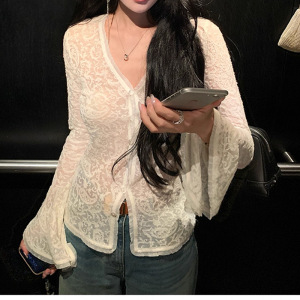 EAR R 迷人蕾丝水袖 立体腰果花v领针织打底女秋长袖上衣透气长袖