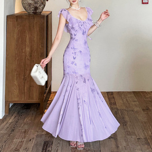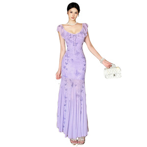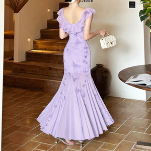 跨境欧美风2025秋季新款女装蝴蝶印花荷叶边领修身显瘦长裙连衣裙