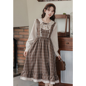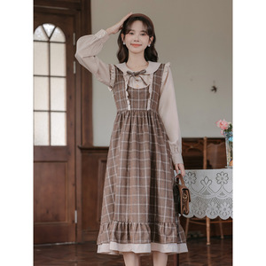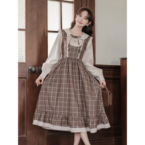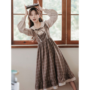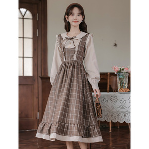 2025秋季新款复古文艺学院风森系格子假两件洛丽塔长袖连衣裙女