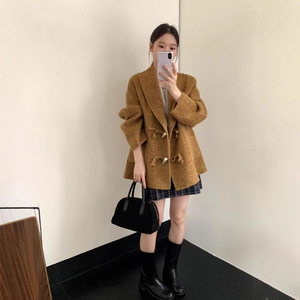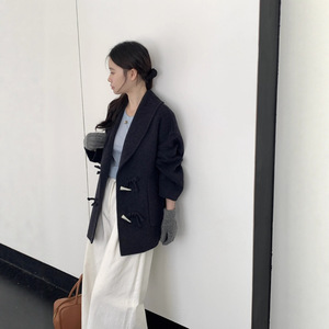 韩系休闲百搭翻领毛呢外套2025秋冬新款双面手缝羊绒牛角扣大衣女