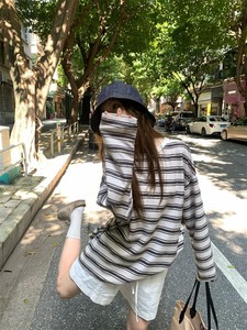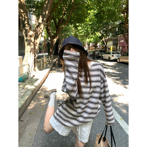 慵懒风条纹长袖T恤女2025秋季新款宽松中长款小众韩系圆领上衣潮