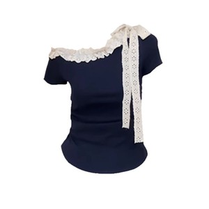 大码蕾丝边露肩系带飘带短袖T恤女夏季新款胖mm修身显瘦遮肚上衣