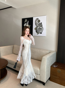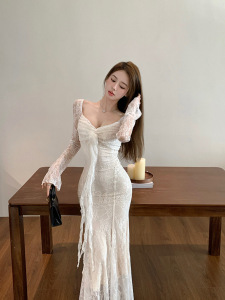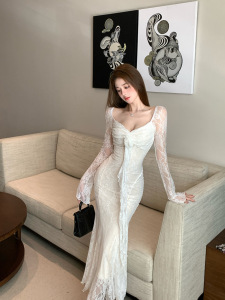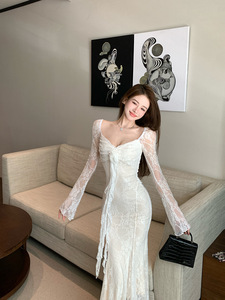 法式白色v领长袖连衣裙女早秋蕾丝拼接修身长裙气质收腰包臀裙子