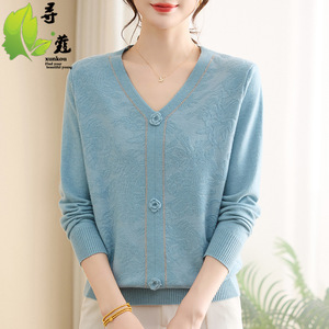 中老年女装秋季长袖上衣女大码宽松妈妈装桃心领中年装烫钻毛线衫