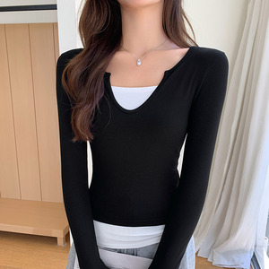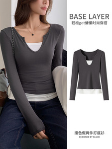 H403严选V领美式复古拼接假两件长袖女修身显瘦设计感辣妹上衣女