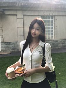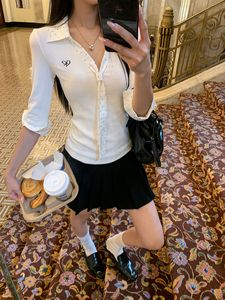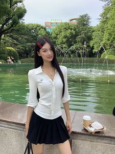 白色波点蝴蝶结系带V领短袖T恤女202早秋新款韩系设计感修身上衣