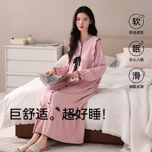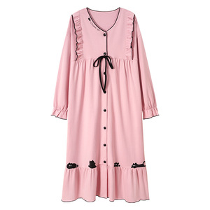 睡裙女春秋拉架纯棉长袖睡衣中长款大码圆领开衫连衣裙卡通家居服
