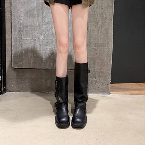 【葡萄妈】辣妹裤管靴~6.5cm增高扣带中筒西部骑士长靴女堆堆短靴