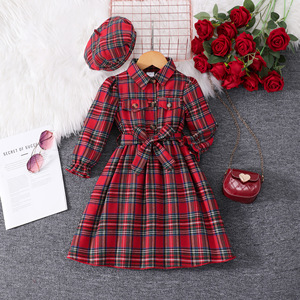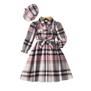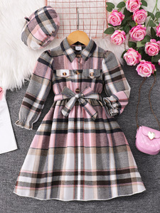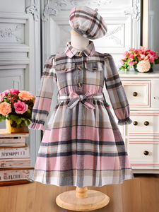 中小童(女)连衣裙,格子长袖腰带连衣裙含帽