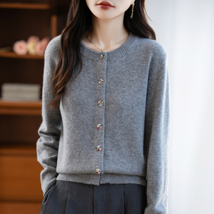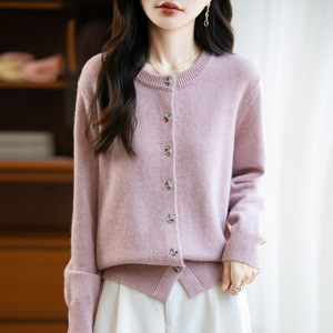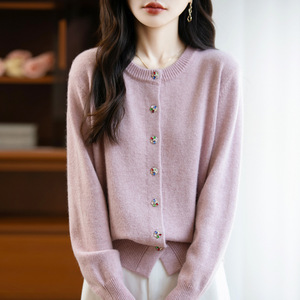 女式浣熊绒针织开衫圆领加厚外套时髦洋气彩钻扣设计个性风外搭潮