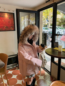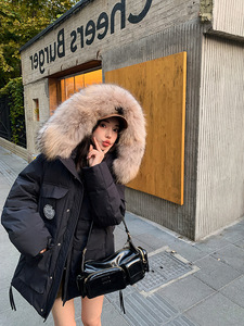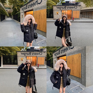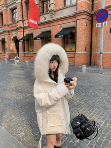 929连帽大毛领2025冬季新款工装派克羽绒棉服 女中长款宽松外套
