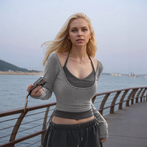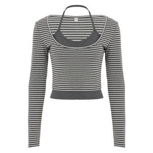 美式辣妹风U型低领两件套条纹T恤挂脖背心2025时尚修身撞色针织衫