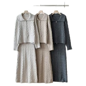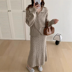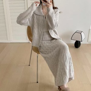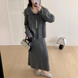 韩系复古温柔风针织套装女秋冬加厚翻领麻花开衫上衣半身裙两件套