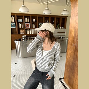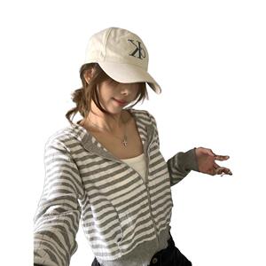 条纹连帽长袖针织衫外套女2025秋季新款韩系显瘦短款开衫上衣chic