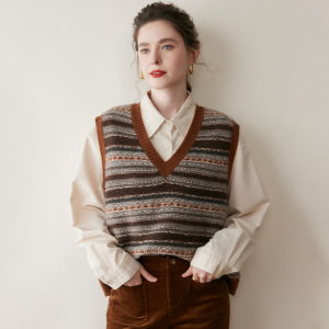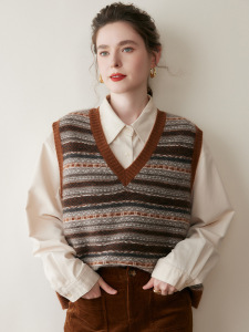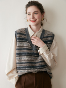 复古马甲女秋季宽松V领山羊绒百搭拼色无袖宽松套头针织衫背心女
