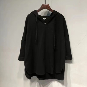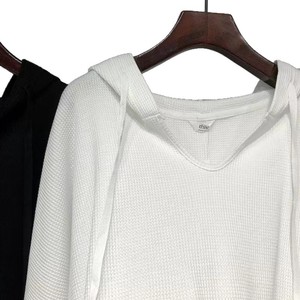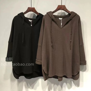 240斤大码宽松薄款纯色华夫格V领长袖上衣女春秋装中长款连帽百搭