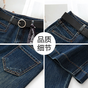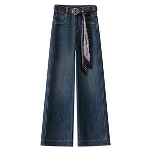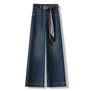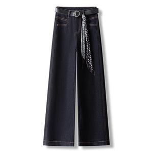 实拍美式深蓝窄版牛仔裤2025年女新款高腰不贴腿弹力直筒阔腿长裤