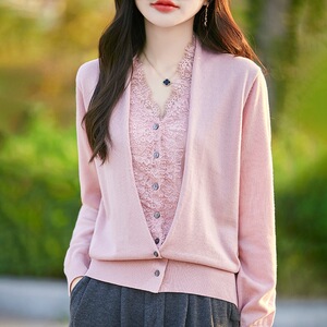 V领蕾丝镂空钩花长袖假两件针织开衫女秋冬新款精仿羊毛外套女秋