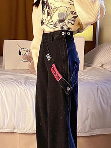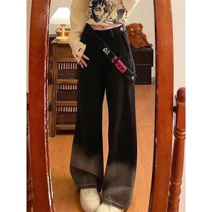 渐变黑灰色侧边拉链阔腿牛仔裤女春秋季美式复古高街直筒高腰裤子