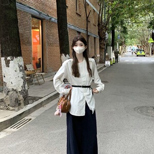 韩系穿搭套装女秋季新款修身条纹长袖衬衫阔腿裤子两件套时尚减龄