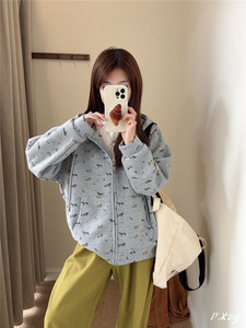016 慵懒风连帽卫衣女秋季新款卡通小狗印花女士拉链开衫外套休闲