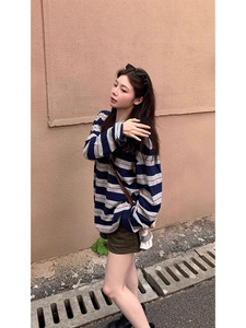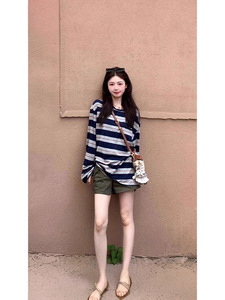 【工厂现货】条纹防晒罩衫长袖T恤女秋季宽松薄款圆领休闲上衣