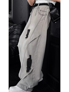 春夏新品原创设计款水洗破洞牛仔裤男美式高街休闲弯刀长裤