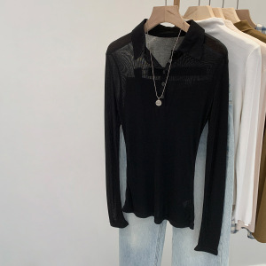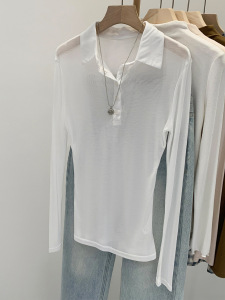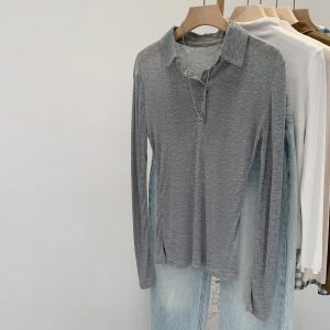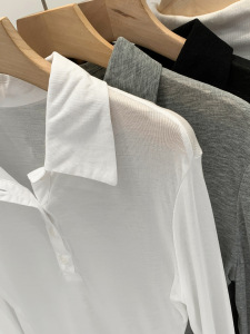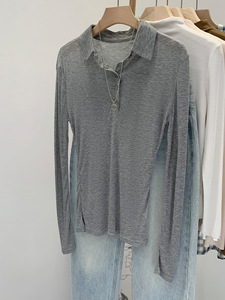 莱赛尔天丝韩系chic别致灰色POLO领薄款长袖T恤2025新款单穿上衣