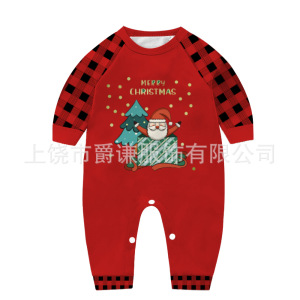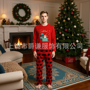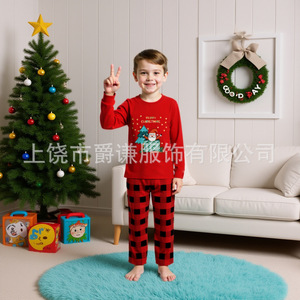 外贸跨境新款圣诞红色格子印花亲子套装休闲圆领长袖家居服睡衣