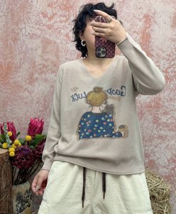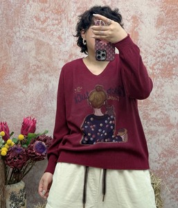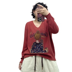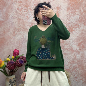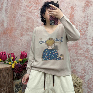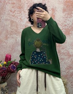 新品V领数码印花宽松休闲棉线套头长袖针织衫薄外套