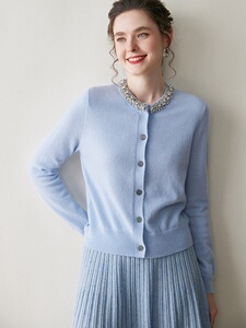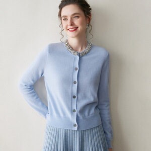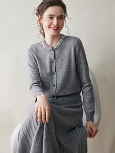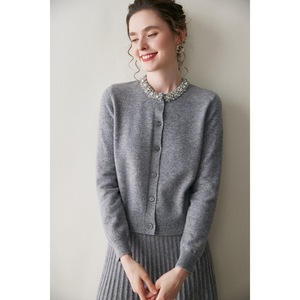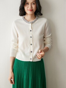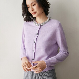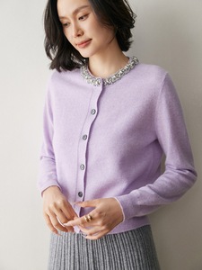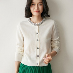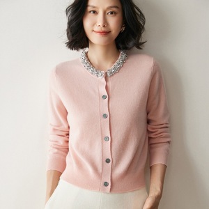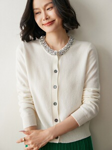 2025秋季新款山羊绒衫圆领开衫女气质镶钻针织衫宽松毛衣外套上衣