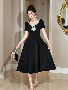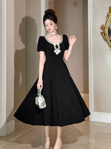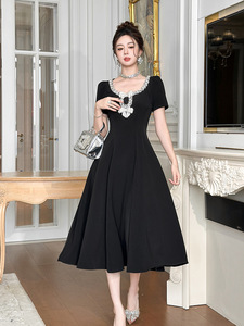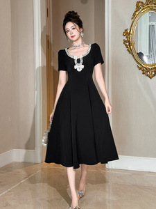 法式重工设计感镶钻蝴蝶结收腰大摆连衣裙千金感黑色长裙女9066