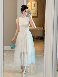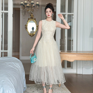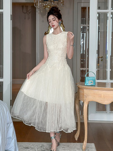 2025夏季新款女装法式圆领收腰网纱拼接蕾丝无袖仙气连衣裙9743