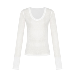 跨境美式复古V领长袖t恤女2025年早秋薄款气质小众内搭打底衫上衣