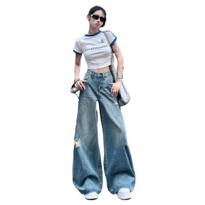 【今茵】街头美式复古破洞洗水工艺显瘦垂感阔腿裤牛仔拖地长裤女