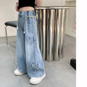 新款女童牛仔阔腿裤春秋款中小童韩版宽松毛边秋季洋气女宝长裤子