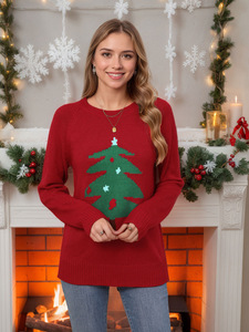 欧美秋冬新款圣诞节跨境亚马逊时尚针织复古提花圣诞树套头毛衣女