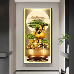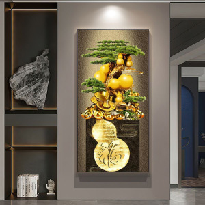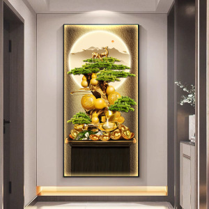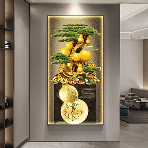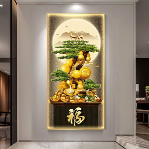 轻奢发财树玄关装饰画新中式葫芦走廊过道挂画迎客松入户带灯壁画