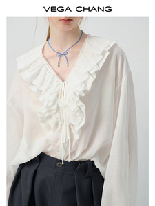 VEGA CHANG白色衬衫女2025秋季新款设计感法式V领荷叶边长袖上衣