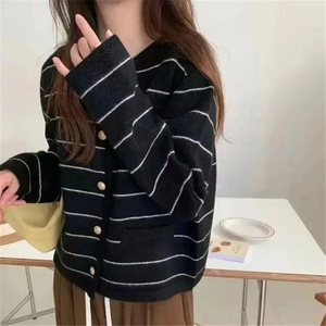 韩版宽松圆领条纹针织开衫女秋冬新款时尚甜美百搭显瘦毛衣女外套