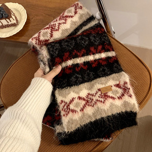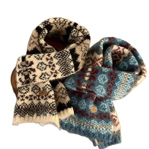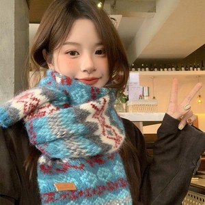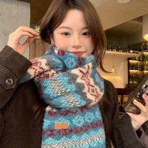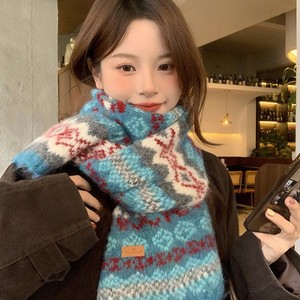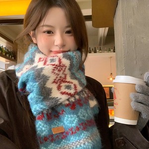 费尔岛风复古蓝色针织羊毛围巾女冬季韩系氛围感学生加厚保暖围脖