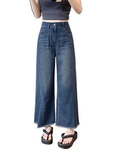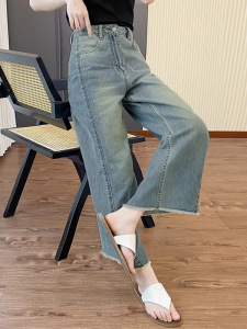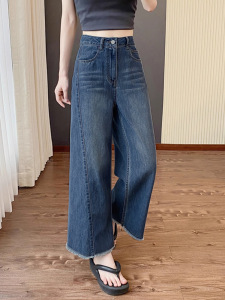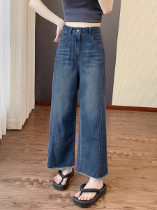 九分阔腿牛仔裤女大码胖mm秋季薄款高腰显瘦宽松直筒垂感深蓝色裤