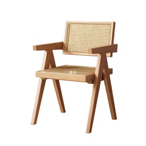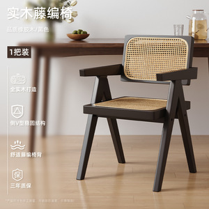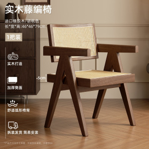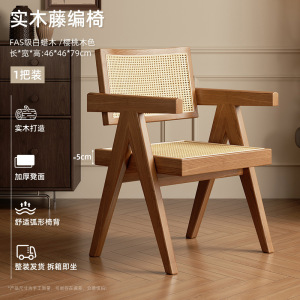 家用藤编餐椅新款中古诧寂风昌迪加尔椅子靠背椅白蜡实木茶椅